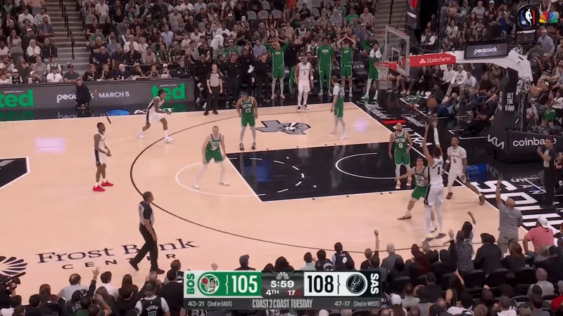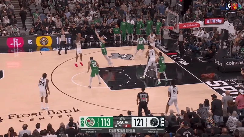 ——剩下41秒前,还是与文班亚马挡拆,强突凯尔特人三人防线,上篮打进,还造成犯规(加罚没进),这一球可以说杀死了比赛