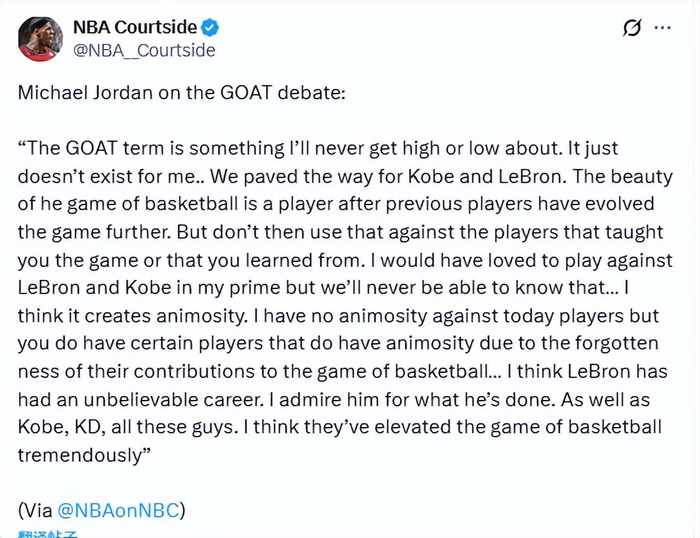“GOAT这个词,我从来不会为此纠结或大喜大悲。对我来说,这种说法根本就不存在,”乔丹说道,“是我们为科比、詹姆斯铺平了道路。篮球最美的地方,就是一代又一代球员让这项运动不断进化。但你不能因此就去贬低那些教你打球、你曾经学习过的前辈。”